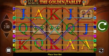 Онлайн-слот Eye of Horus The Golden Tablet использует классическое поле с 5 барабанами по 3 ряда и 10 фиксированных линий для выплат. В игре встречаются как обычные, так и специальные знаки, а выигрышные комбинации формируются слева направо. Четыре младших и шесть старших символов оплачиваются от трех одинаковых штук на линии. Самое дорогое изображение глаза приносит выигрыш и за 2 знака. В игре есть бонусный раунд фриспинов с заменой символов, который позволяет получать крупные выплаты. Максимальный приз составляет х50000 от ставки, которую можно выбирать от 0.1 до 50 евро.