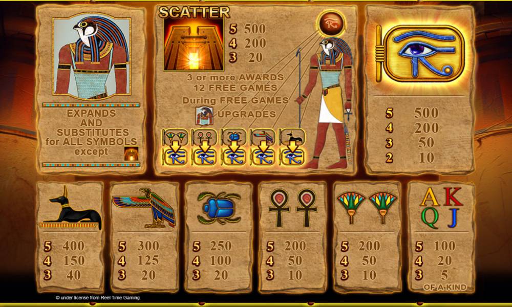 При выпадении трех и более знаков Scatter на поле игрок получает 12 фриспинов. Разыгрываются они на стандартных правилах с последней действующей ставкой. Во время раунда действует функция Symbol Upgrade. Каждый Гор при выпадении заменяет менее ценные знаки на более дорогие (изображение глаза). Делает он это постепенно — за одно выпадение одна замена. Младшие символы не участвуют в этой функции.