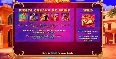 Танцующие пары, участницы карнавала, музыканты, инструменты и алкогольные напитки – такие изображения вы увидите на экране слота Fiesta Cubana. Персонажи, которых здесь пятеро, могут быть задействованы в респинах, о чем рассказывается ниже. Особыми символами являются такие элементы: