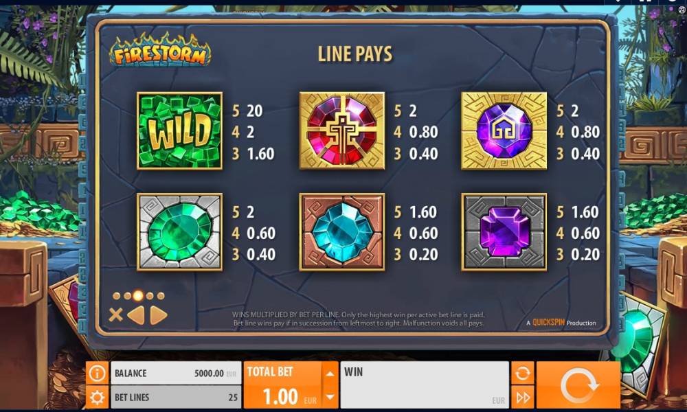 В видео-слоте «Огненная буря» пять барабанов и двадцать пять постоянно активных линий. Менять их количество пользователь не может. Играть на игровом автомате можно по ставке на линию от одного цента до десяти евро. На спин разрешается ставить до двухсот пятидесяти евро.