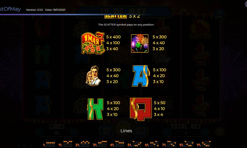 Игровой автомат First of May от провайдера Spinomenal посвящен празднику Первого Мая. Если вам улыбнется удача, то в этом слоте вы сможете выиграть крупные призы, вплоть до 2000 ставок.