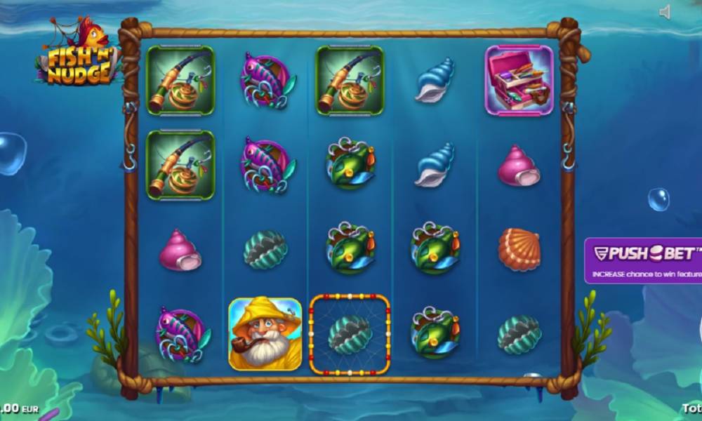 Открыв слот Fish 'n' Nudge, игрок сразу становится участником большой рыбалки. Главные события происходят на пяти барабанах с четырьмя рядами символов и 20 линиями выплат. Диапазон ставок по умолчанию — от 0,1 до 100 у.е, но если использовать Push Bet, можно подрастить ставку на 20%, одновременно на 42% увеличив вероятность выигрыша.