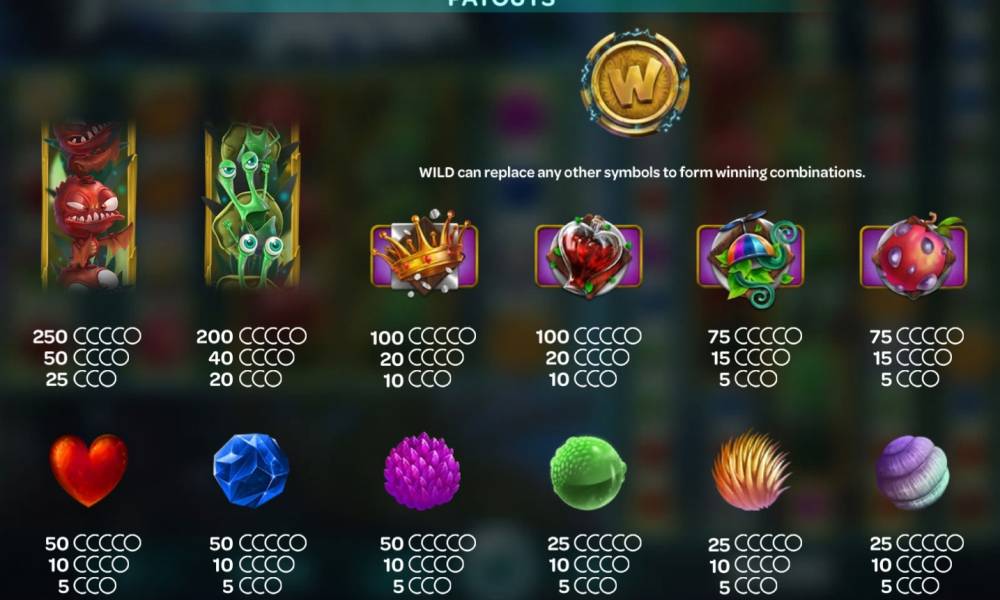 Запустив игровой аппарат «Лесная мания», вы увидите загадочных существ. Некоторые из них занимают сразу несколько ячеек на барабанах. Впрочем, все картинки могут идти очень длинными вертикальными полосами. Также на экране возникают сердечки, короны, фрукты, ягоды и всевозможные странные предметы, происхождение которых объяснить довольно трудно.