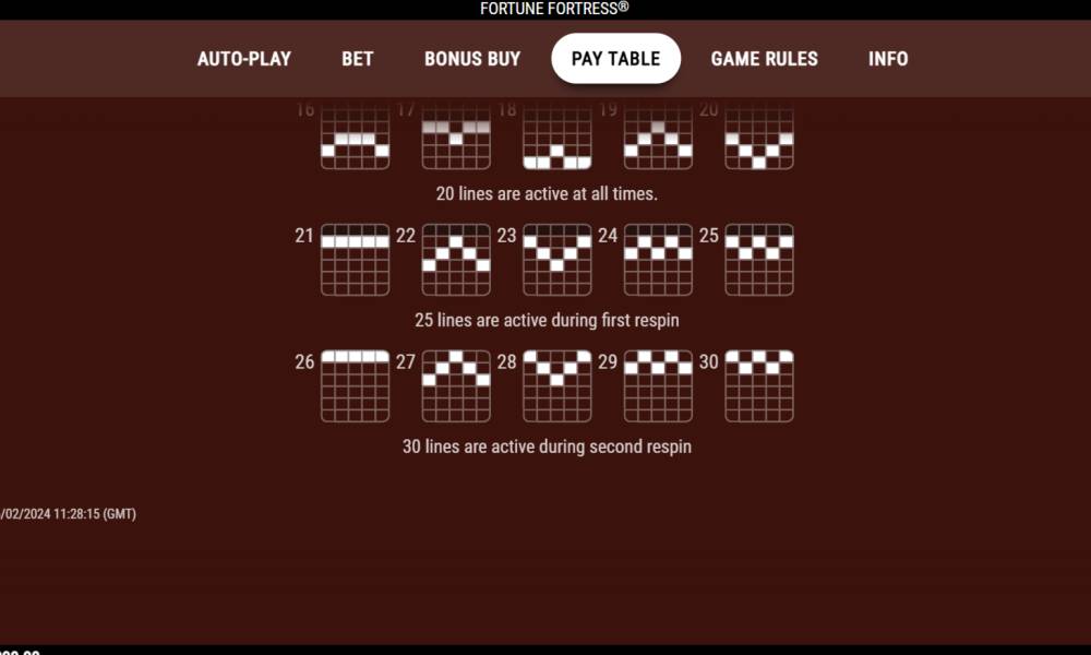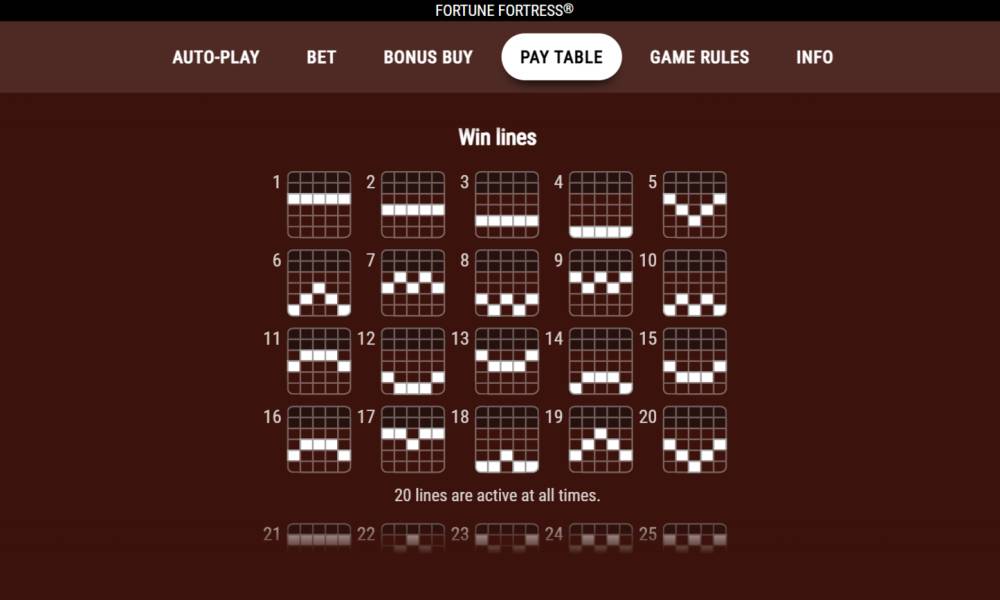Игровое поле Fortune Fortress состоит из 5 барабанов, расширяющиеся от 4 рядов до 6 рядов с респинами. Активны 20, 25 и 30 линий выплат для 4, 5 и 6 рядов соответственно. Выплачивается только самый высокий выигрыш за активную выигрышную линию.