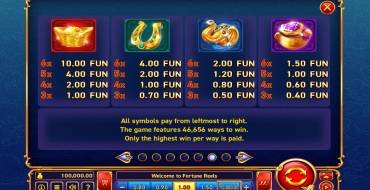 В слоте Fortune Reels игроки могут ожидать интересный игровой процесс с несколькими ключевыми элементами. Игра имеет макет с 6 барабанами и 4 рядами, а количество линий выплат составляет 46656, что обеспечивает множество возможностей для формирования выигрышных комбинаций. Символы в игре включают различные восточные элементы, а также уникальные Wild символы, которые заменяют все обычные символы и увеличивают шансы на выигрыш. Диапазон ставок варьируется от 0.2 до 10000 монет.