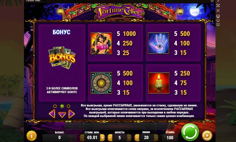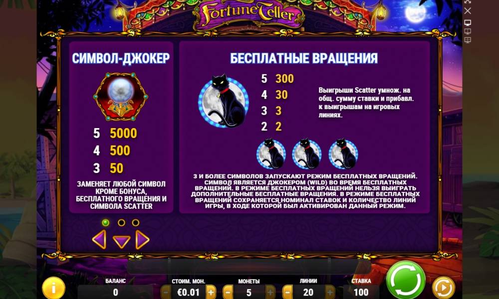 В игре есть режим автоматических ставок с настройками, возможность отключения звука и другие параметры. Правила видео-слота Fortune Teller подробно объясняются в справочном разделе.
