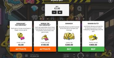 В онлайн-слоте FRKN Bananas под интерфейс выделено минимум места. Под игровым полем расположено основное меню, опции ставки и кнопки запуска вращений. Немного левее можно найти кнопку "Buy Feature". Начать игру очень просто: