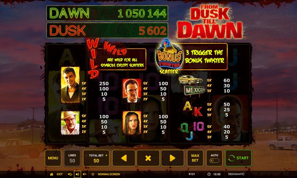 Компания Novomatic посвятила знаменитому боевику-ужастику красочный игровой аппарат From Dusk till Dawn, о котором рассказывается далее в обзорной статье Casinoz.