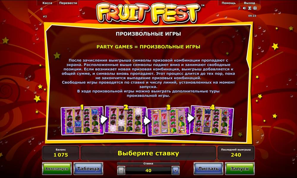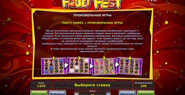 Компания Novomatic давно переводит все новинки на русский, так что вам остается лишь найти заведение, предлагающее такую версию игры (например, Star Games). Если вы хорошо знакомы с моделями данного бренда, панель управления «Праздника фруктов» ничем вас не удивит. Ставка определяется плюсом и минусом возле специального окошка. Запустив барабаны, их сразу можно остановить той же кнопкой. Самый быстрый спин будет при его активации двойным кликом. Тот же прием можно использовать для ускоренного вывода денег на счет. В таблице перечислены все коэффициенты расчета выигрышей, а также разъясняются общие правила и условия участия в бонусных раундах. Больше информации о характеристиках модели предлагается в справочном разделе «Помощь». Настройки – это параметры экрана и звука. Скачивать Fruit Fest не приходится, ведь слот запускается в браузере.