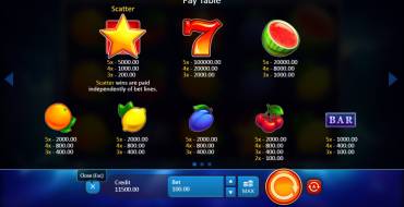 Базовых картинок семь: BAR, вишни, слива, лимон, апельсин, половинка арбуза и большая семёрка. Одинаковые иконки могут выпадать на экране вертикальными полосами, заполняя целые столбцы.