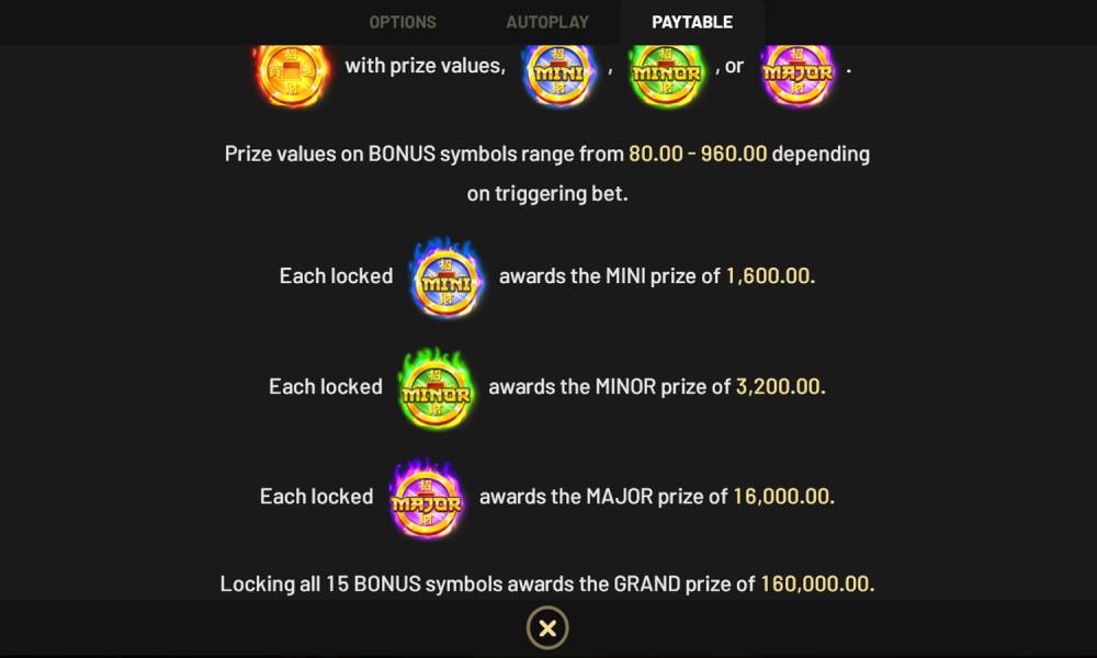 Bonus — показывает рандомный множитель ставки от х1 до х12. Изначально выпадает в виде золотого дракона, который потом трансформируется в монету. Бонусные символы могут останавливаться в любых местах игрового поля, но оплачиваются только в раунде Hold&Win Feature.