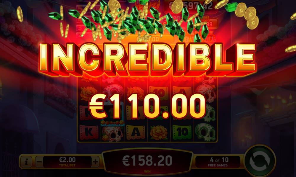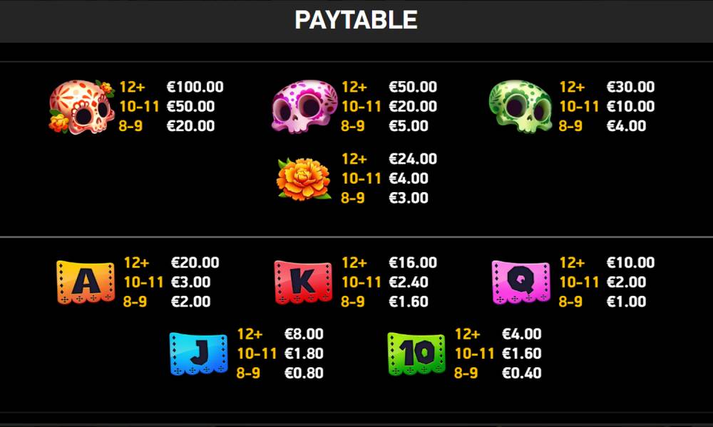 Scatter (Sugar Skull). В простых вращениях 4+ Scatter на любых ячейках запускают раунд фриспинов. Во фриспин-раунде 3+ Scatter на любых ячейках добавляют +5 ФС. В простой игре и фриспинах 4+ Scatter дополнительно платят от х3 до х100 от ставки (в зависимости от количества Scatter).