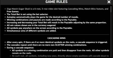 Подведем итог: Giga Match Sugar Skull — интересный слот без серьезных недостатков. Должен понравиться новичкам и опытным гемблерам. Нередко платит, часто запускаются каскады, за 1 час игры я 2 раза выигрывал джекпоты (х10 и х200).