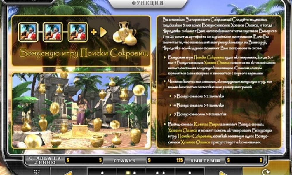 На пяти барабанах слота пользователь может попасть к оазису, а помощь в этом окажет компас веры. Во время игры можно встретить скорпиона смерти, золотую кобру, хозяина оазиса, скрытый оазис, чародейку-танцовщицу. В слоте имеются специальные символы, обладающие широкими возможностями: Scatter - затерянные сокровища в виде изображения сундука с золотыми монетами. Символ умножает общую ставку. Если выпадает от двух символов, то выигрыш умножается от 2 до 300 раз. Три и более Scatter на любых местах игровых барабанов начинают раунд бесплатных вращений. В таких случаях выигрыш гарантируется практически всегда. Каждому игроку, сумевшему поймать 3, 4 или 5 символов, предоставляется 10 бесплатных игровых раундов с множителем х3. Wild - компас веры – помощь в получении большего количества выигрышных комбинаций и увеличение шансов на призовую игру. Он может заменять все смиволы, и даже символ Bonus, открывающий двери в бонусный раунд. Scatter заменять не может. Bonus - хозяин оазиса - возможность попадания в призовую игру, если выпадет 3-х и более символов на игровой линии.