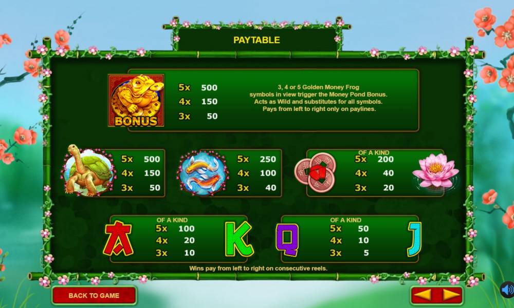 Money Pond Bonus – Этот раунд напомнит вам о старинном аппарате «Лягушки». Вы увидите листья кувшинок на воде и должны будете указывать лягушонку, на какой лист прыгать. Здесь три уровня. Чем дальше заберется ваш персонаж, тем крупнее будет итоговая выплата. Если он окажется на другом берегу, его ждут золотые лилии с увеличенными призами.