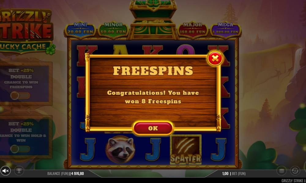 В онлайн-слоте Grizzly Strike Lucky Cache от провайдера Iron Dog Studio грозно рычит медведь, но это радует, потому что означает образование выигрышной комбинации. Среди символов диких животных мелькают монеты, которые в любой момент могут пролиться золотым дождем. Бонусная игра с респинами и призами, а также бесплатные вращения с удвоением выплат дарят шанс на солидное вознаграждение, максимум которого составляет х5 000 к установленной ставке.
