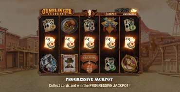 На барабанах видео-слота Gunslinger можно увидеть различные картинки, имеющие отношение к Дикому Западу. Это звезда шерифа, револьверы, красотка в характером для той эпохи наряде, сумка с золотыми слитками, а также игральные карты от десятки до туза. Кроме того, в игровом автомате Gunslinger есть несколько специальных символов: Wild (стрелок, являющийся главным героем), Scatter (белый конь, вставший на дыбы) и два бонусных (объявления о награде за трех разных бандитов и бутылка с виски). Wild сам образует комбинации, а также заменяют другие картинки (кроме Scatter и бонусных), если в этом есть необходимость. Scatter оплачиваются в любой позиции на экране, а сумма выигрыша рассчитывается по общей ставке (от двух до двухсот за два – пять Scatter). Bounty Hunt Bonus – три любых объявления о вознаграждении за поимку преступника, расположенные на активной линии, запускают тематическую бонусную игру. Shoot a Bottle Bonus – три подобных символа дают старт бесплатным спинам по текущей ставке и количеству линий. Количество запусков устанавливается после выстрела по бутылке. Выигрыши в спинах удвоены. Раунд можно продлевать.