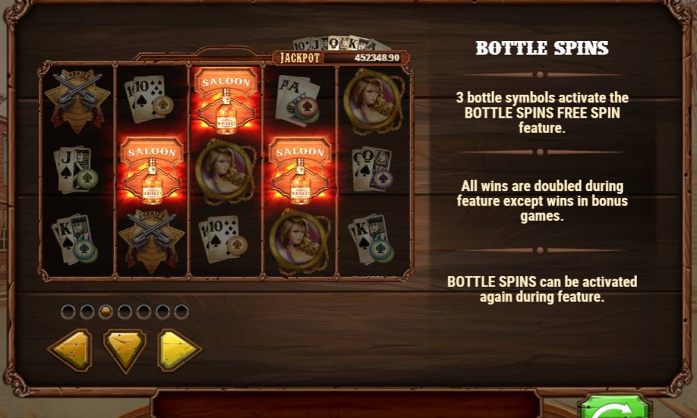 Давайте разберемся с тематической бонусной игрой Bounty Hunt Bonus, которая запускается на отдельном экране. Сначала вы укажете, кто из трех бандитов будет вашим соперником. Затем вы будете идти по пустынной улице классического городка из вестернов. Сначала на вашем пути будут попадаться бочки. Вам нужно будет разбивать выстрелами по одной из них. Каждая бочка дает определенный выигрыш. В конце пути вам предстоит дуэль с бандитом. Вы укажете, в какую часть тела следует стрелять. Если вам удастся победить, заработанные ранее деньги будут умножены на случайный коэффициент. О бонусном раунде Turn the Card, в котором разыгрывается прогрессивный джек-пот, читайте ниже.