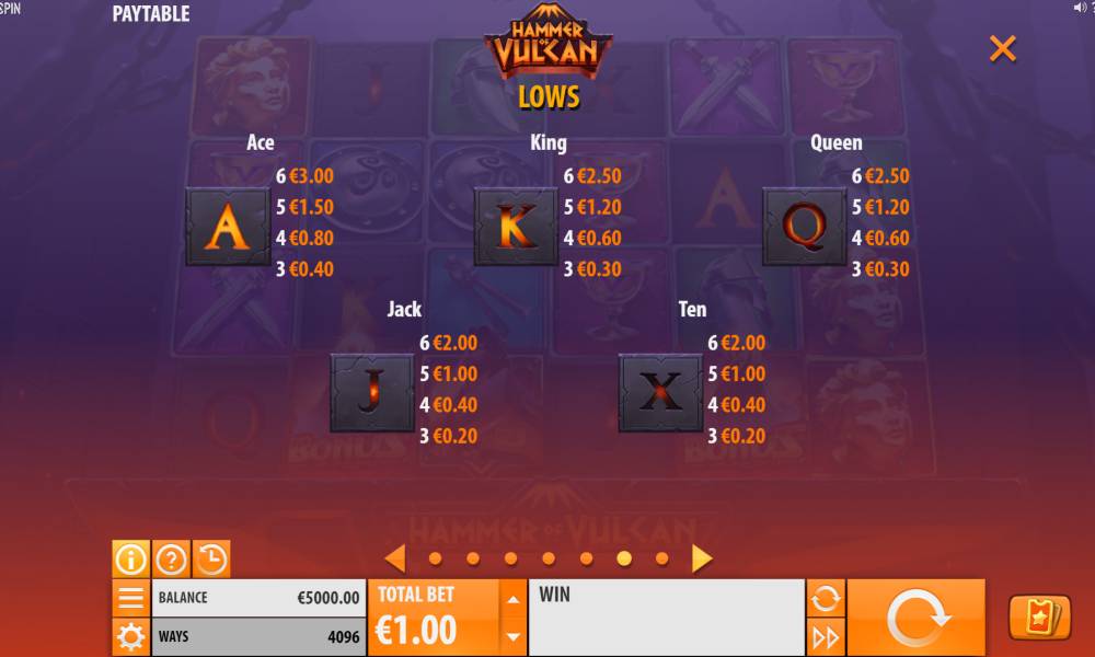 Слот Hammer of Vulcan от провайдера Quickspin имеет поле вида 6х3 с 4096 комбинациями.