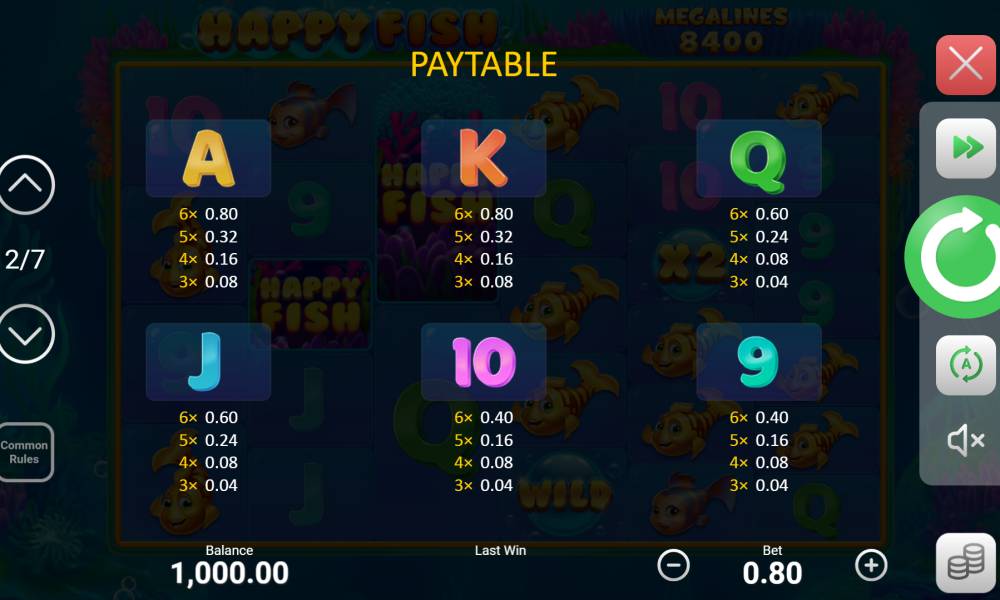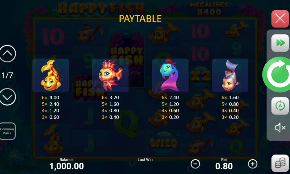 Минбет в слоте Happy Fish равен 20 центам.