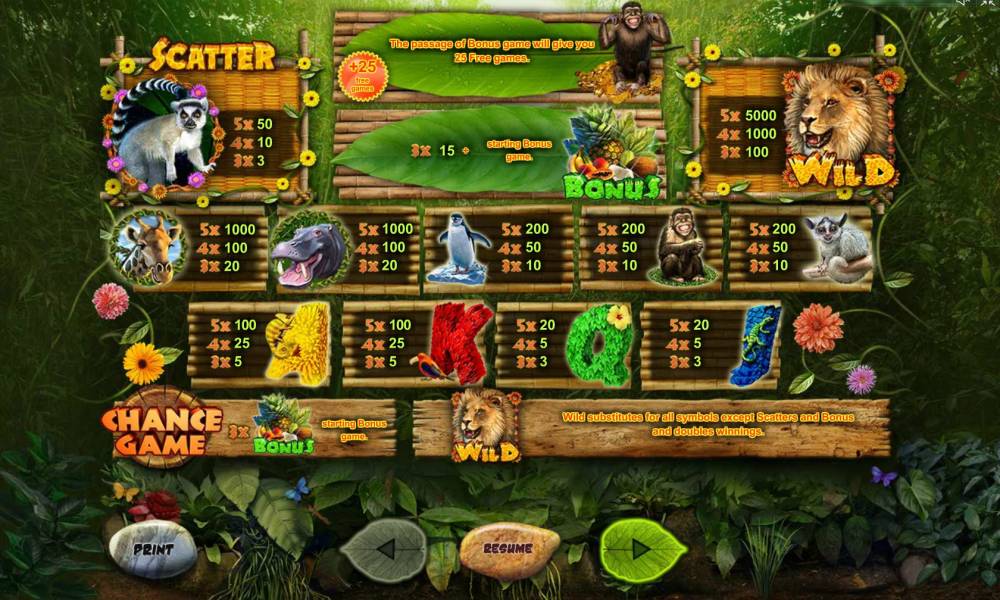 В игре очень мало пользовательских настроек. Можно лишь развернуть окно на весь экран и отключить звук (кнопки в правом верхнем углу). В таблице выплат вкратце рассматриваются все аспекты правил, особые символы, множители комбинаций и схема расположения линий. Вам не нужно скачивать игровой автомат «Счастливые джунгли». Эта модель открывается непосредственно в браузере на сайте интернет-казино.