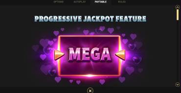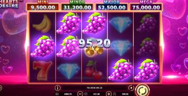В онлайн-слоте Heart's Desire 5 барабанов по 3 ряда в каждом. Игра использует 4 младших и 3 старших вида символов. Все они оплачиваются от трех штук на линии. Засчитываются комбинации из одинаковых символов, составленные слева направо. В слоте 30 фиксированных линий для выплат. Диапазон ставок — 0.3-120 евро. Максимальный выигрыш составляет х1787 от поставленной суммы. Бонусов немного, но зато с ними можно сорвать крупный куш. Они представлены фриспинами, специальными символами и джекпотами.