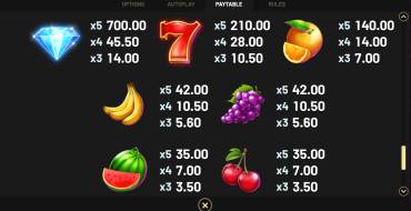 | Тематика | Фрукты/овощи, Классические слоты, Удача, Действие, Еда, Драгоценности, Роскошь, Казино, Деньги, Алмазы |