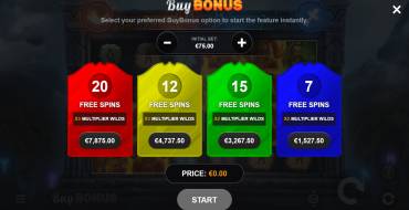 Buy Bonus. Здесь продаются 4 пакета фриспинов с количеством вращений 7, 12, 15 и 20. У двух первых пакетов действует дополнительный множитель у Wild х2, у двух дорогих — х3.