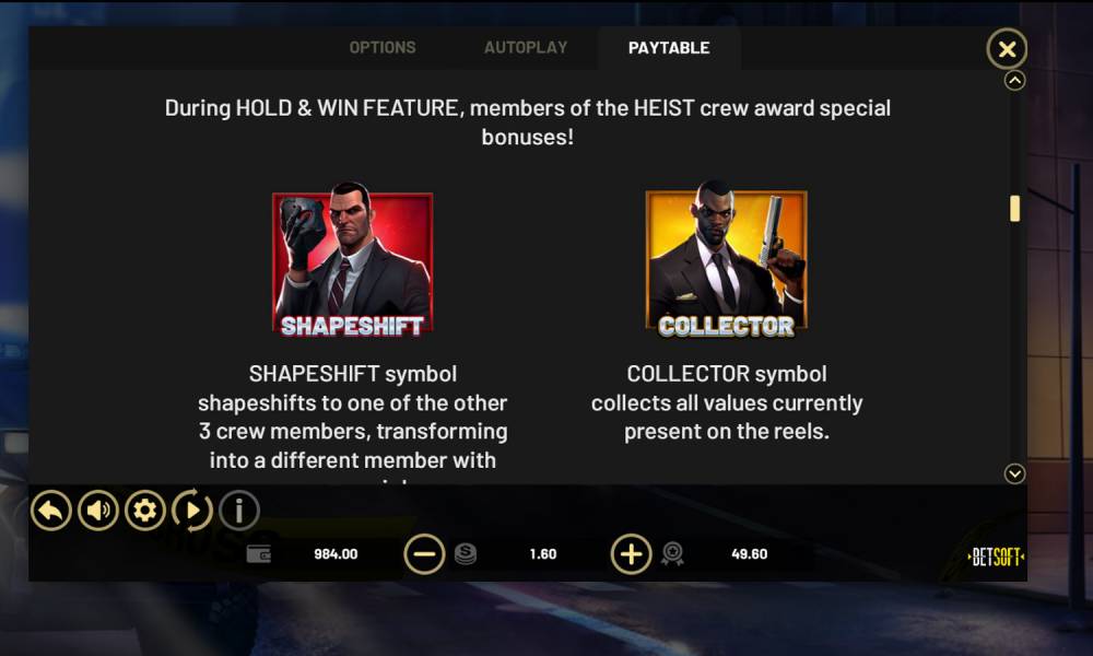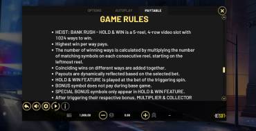 В онлайн слоте Heist: Bank Rush — Hold&Win 5 барабанов по 4 ряда. Фиксированных линий выплат 1024. Базовые символы представлены 4 старшими и 5 младшими. Все они дают выплату от трех штук на линии. Есть также специальные знаки с особыми функциями и правилами оплаты. Диапазон ставок совсем небольшой — 0.2-10 евро, что связано с механикой слота и частыми выплатами. Есть всего один бонусный раунд, фриспины и джекпоты не предусмотрены.