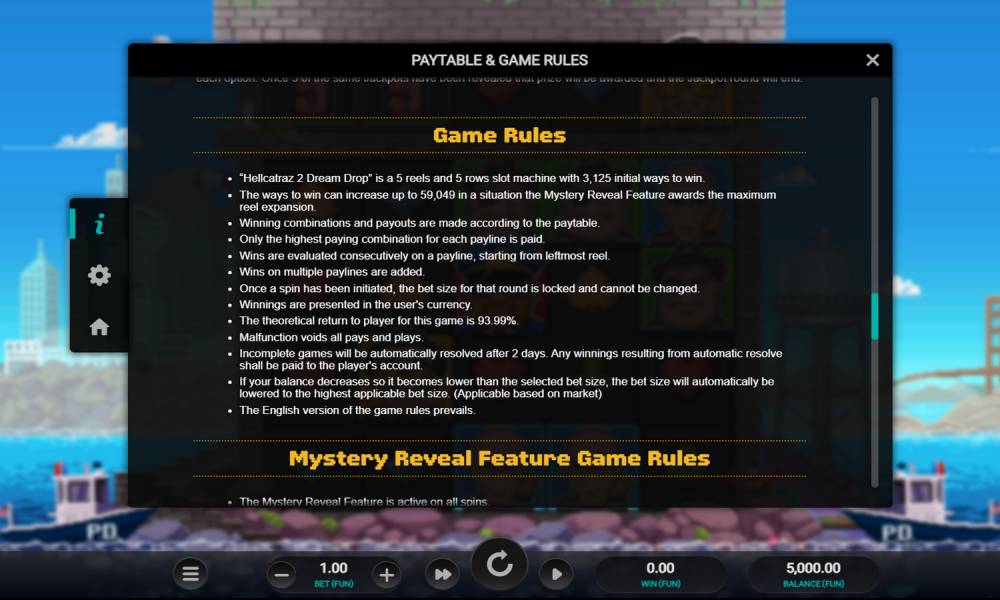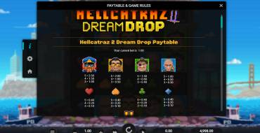 В Hellcatraz 2 Dream Drop разыгрываются 5 прогрессивных джекпотов размером от нескольких евро до 3 млн евро. Раунд, в котором их можно выиграть, может запуститься перед любым вращением. В мини-игре есть поле с 15 ячейками, под которыми скрыты символы каждого из 5 джекпотов. Гемблеру нужно открывать их, пока на поле не появится 3 одинаковых знака. Этот джекпот и будет выплачен.