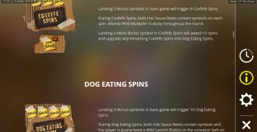 10 Dog Eating Spins. Запускается при появлении на поле 4 символов Scatter. По функциям раунд аналогичен предыдущему, только здесь все время работает знак Wild Launch Button, который разблокирует специальные барабаны.