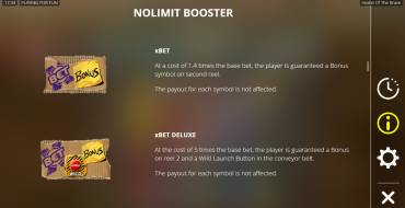 Nolimit Booster. За х333 от ставки пользователю доступен раунд The Satan Spin, во время которого Hot Sauce Reels полностью заполнены, а на поле выпадает символ Wild Launch Button. За х1.4 игроку гарантирован знак Scatter на барабанах, а за х5 — он же плюс дикий символ, который разблокирует боковые катушки.