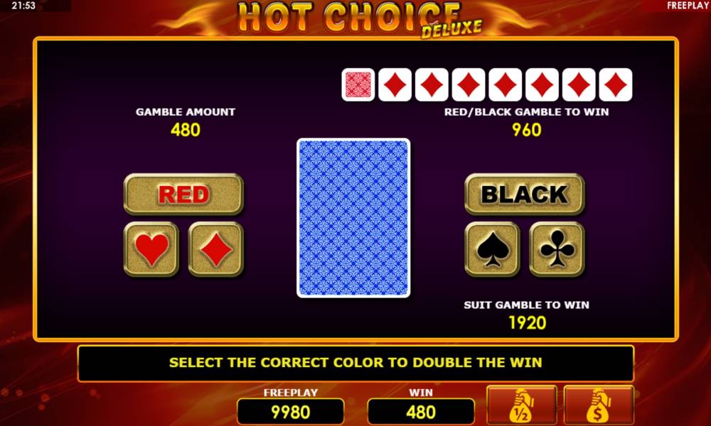 В слоте имеется риск-игра, которая позволит увеличить приз при угадывании масти или цвета закрытой карты.