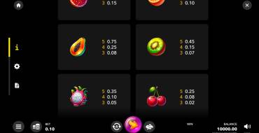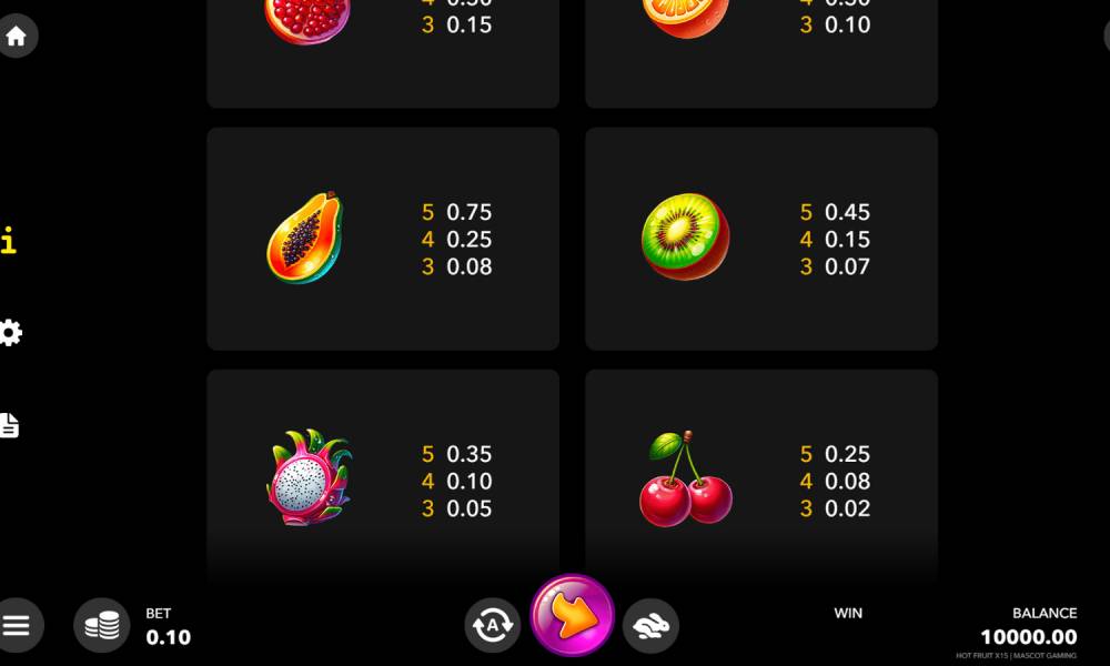 Hot Fruit x15 — это слот с выплатами за линии. Они работают в обе стороны (слева направо и справа налево). Есть 10 фиксированных линий, их количество нельзя изменить. В каждую должно войти минимум 3 одинаковых символа. Размеры поля 5х3. Всего в игре участвуют 10 символов, из которых 8 простых и 2 специальных. Из бонусных функций добавлены риск-раунд и дополнительные множители за каждый выигрыш, если их выпадает 2+ подряд.