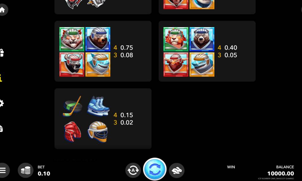 Дизайн Ice Number One посвящен хоккею: на заднем плане ледовая площадка, а само поле помещено в ворота. Справа от поля расположена кнопка Buy Free Spins. Остальные элементы интерфейса собраны вдоль нижнего края экрана. Справа отображается текущий баланс. Рядом расположена кнопка регулировки звука. Левее от баланса показывает выплату, которая только что получена. Под полем по центру находятся 3 кнопки, связанные с запуском барабанов. Это автоматические вращения, ручной запуск и ускорение барабанов. В автоспине есть несколько настроек для остановки режима. В левом нижнем углу есть еще 2 кнопки: меню и изменение размера ставки. В меню спрятаны информация (таблица выплат, правила слота) и настройки звука и полноэкранного режима. Несколько советов, которые пригодятся всем, кто будет играть в Ice Number One: