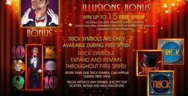 В видео-слоте Illusions 2 бонусный раунд имеет вид пятнадцати бесплатных спинов по текущей ставке и количеству линий. Во время этих запусков на экране также появляются также дополнительные символы Wild, которые здесь называются Trick. Они расширяются на весь барабан и остаются в такой позиции до конца раунда.
