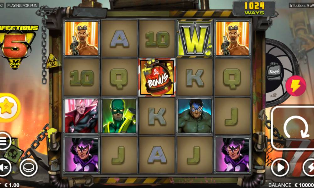 Infectious Spins: Toxic Hazard. Три символа Bonus дают 9 фриспинов, а четыре — 10. На трех центральных барабанах при каждом спине будет останавливаться от 1 до 5 символа Wild. Это дает возможность активировать функцию Infectious xWays каждый раз при выпадении знака xWays, который всегда будет показывать только дорогие символы.