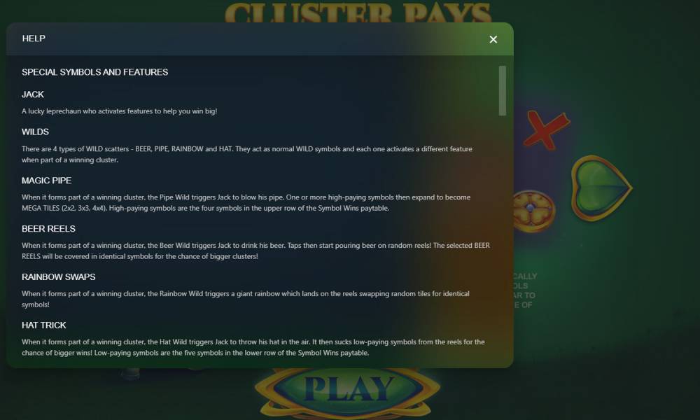 Jack In A Pot — это слот от провайдера Red Tiger Gaming, выпущенный в ноябре 2018 года. Посвящен ирландской мифологии: главный герой — лепрекон. Поэтому дизайн оформлен в золотых и зеленых оттенках. Несмотря на название, джекпотов в слоте нет, и максимальная выплата сравнительно небольшая — х1743. Игровой процесс очень интересный, потому что поле большое (7х7), выплаты формируются за кластеры знаков, и есть необычные Wild-функции.