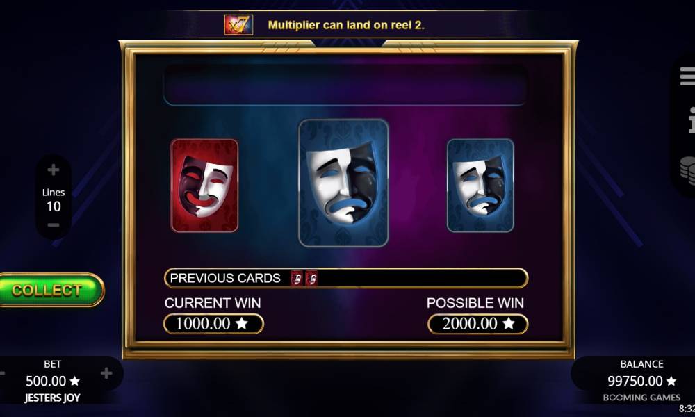 В слоте Jesters Joy от провайдера Booming Games есть бонусная функция "Игра на риск" после любого выигрыша, которая дает шанс экспоненциально увеличить призовую сумму несколько раз подряд. От вас останется только угадать какая из двух масок выпадет, веселая или плачущая.