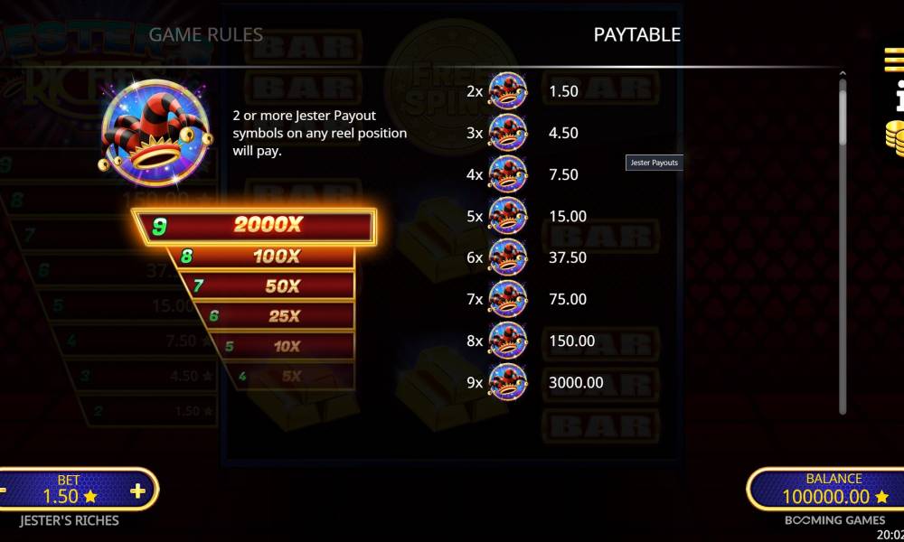 Вместо традиционного джекпота в Jester's Riches есть выплаты за 2–9 символов Jester Payout. Размеры призов всегда отображаются слева от поля.