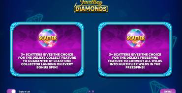 В видеослоте Jewelling Diamonds имеется 6 барабанов в 4 ряда, а количество выигрышных путей достигает 4096. Выпадение одинаковых символов оплачивается с 3 штук, при этом необходимо, чтобы сочетания составлялись подряд начиная с левого крайнего барабана. В случае появления нескольких выигрышных комбинаций они суммируются. Самым высокооплачиваемым символом является Семерка, она дает множитель х5 к ставке при выпадении 6 штук одновременно. В игре использованы следующие функции: