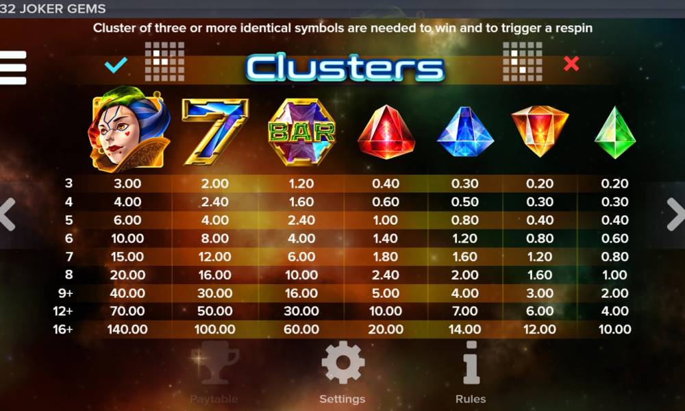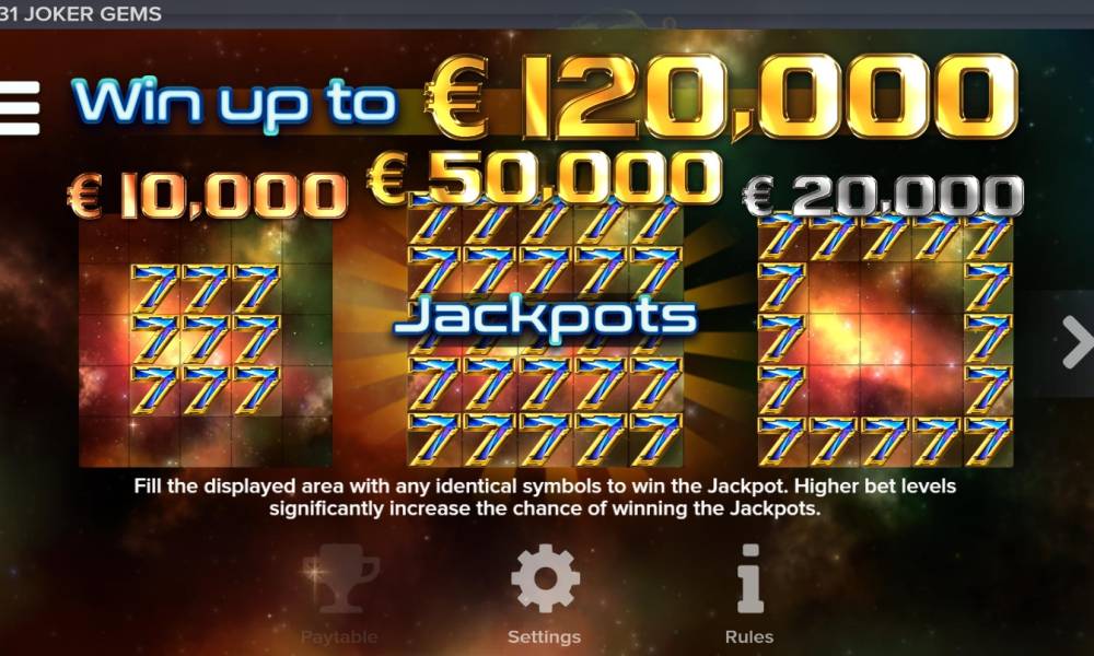Накопительных джекпотов нет. В Joker Gems разыгрываются три фиксированных суммы. Чтобы получить одну из них, нужно заполнить выигрышными символами ячейки по определенным шаблонам.
