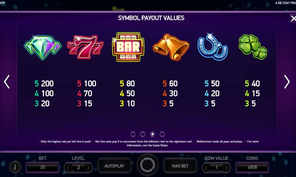 Азартные игры NetEnt традиционно имеют интуитивно понятную таблицу коэффициентов и максимально подробный справочный раздел со всеми характеристиками.