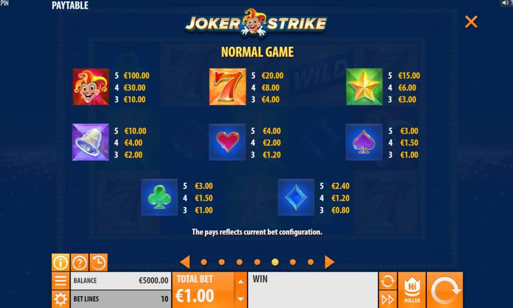 В видеослоте Joker Strike есть 5 барабанов в 3 ряда и 10 фиксированных линий выплат. Для выигрыша необходимо, чтобы сочетание из 3 и более одинаковых символов складывалось начиная с крайнего левого барабана и шла в правую сторону подряд, без пропусков. Каждая выигрышная комбинация запускает бонусную функцию Joker Strike, которая повышает шансы на выплаты. Диапазон ставок – от 0.1 до 100 евро. Если на поле появляется 3 и более одинаковых символов, к ставке применяется определенный множитель, значение которого зависит от вида и количества выпавших символов. Узнать значения множителей можно из таблицы выплат, при этом в слоте используются 2 таблицы: