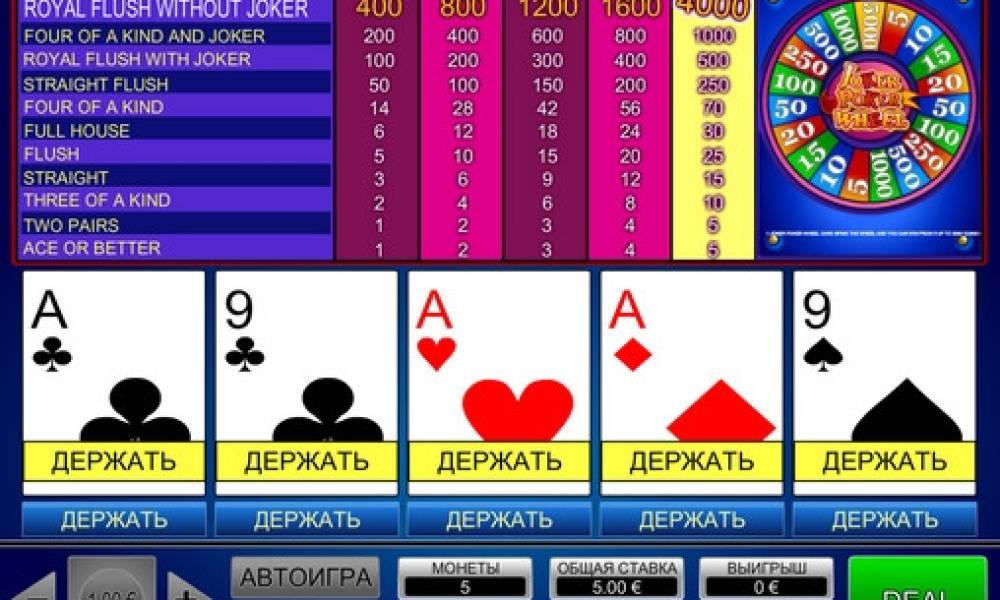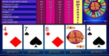 Чтобы получить выплату в Joker Wheel Poker, нужно собрать покерную комбинацию, предусмотренную правилами. Разрешается один раз поменять бесплатно до пяти карт.