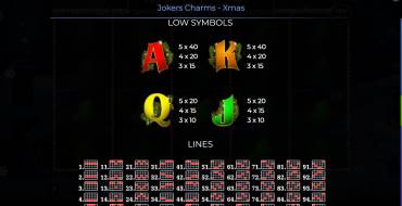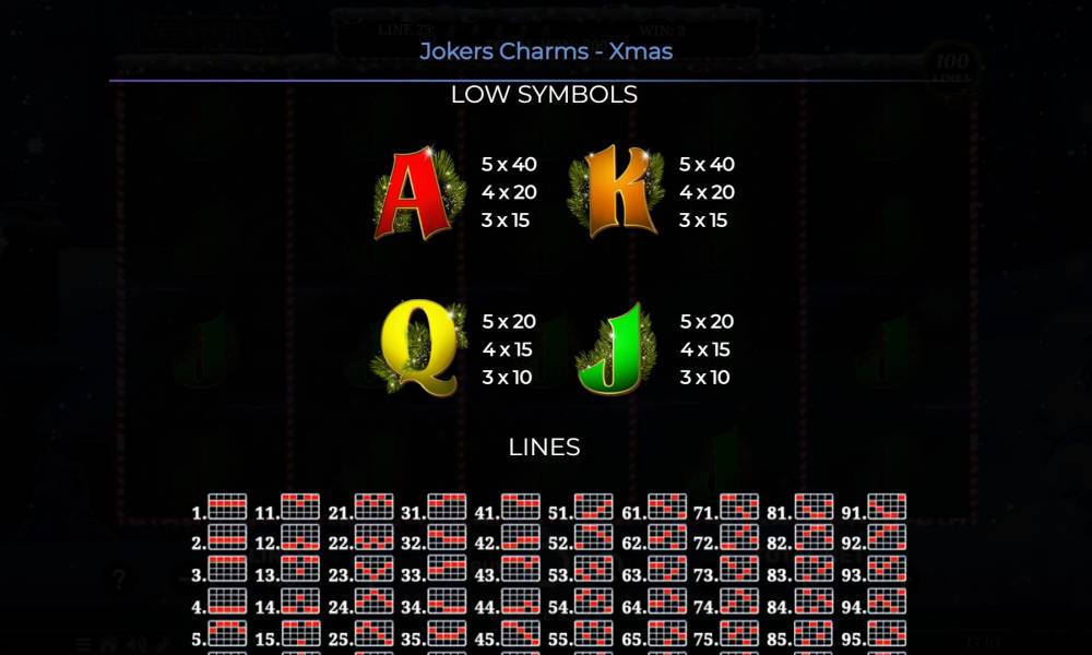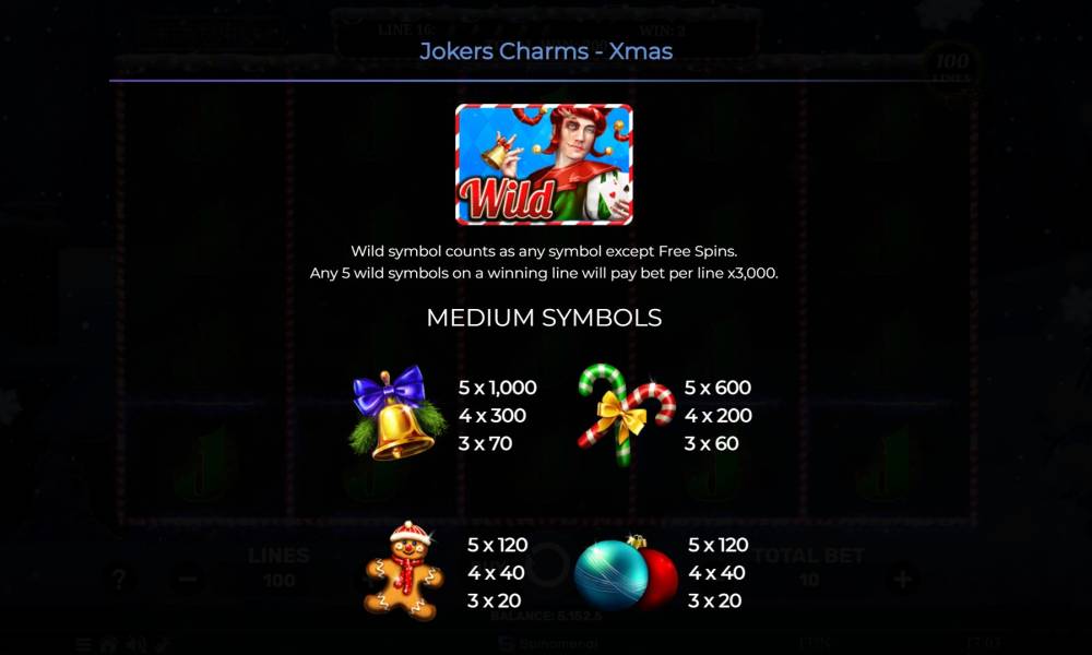 Joker’s Charms – Xmas имеет игровое поле формата 5x4 и позволяет пользователю самостоятельно выбирать количество активных линий выплат – от 10 до 100. В игре представлены 8 стандартных и 2 специальных символа. Выигрышные комбинации формируются при совпадении минимум трех одинаковых значков подряд, начиная с левого края (также с помощью символа Wild). Фриспины запускают бонусный режим, где в каждом раунде на барабанах гарантированно появляется хотя бы один Stacked Wild, что значительно повышает шансы на составление выигрышной комбинации. Диапазон ставок варьируется от 0.1 до 1000 евро за спин. Важно учитывать, что увеличение числа активных линий автоматически повышает сумму ставки!