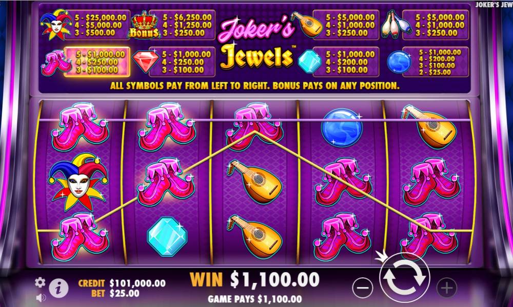 В видео-слоте «Драгоценности джокера» пять барабанов, пять фиксированных линий и пятнадцать ячеек для символов на экране.