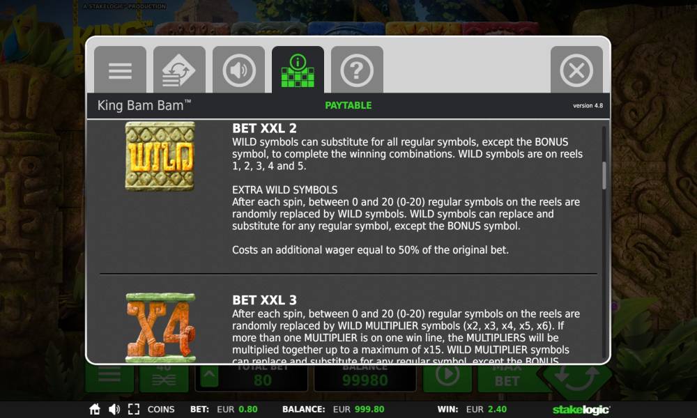Игровой аппарат King Bambam от компании StakeLogic перенесет вас в далекие джунгли, где, вдалеке от людей, правит своим племенем добродушный король павианов Бамбам. Модель представляет интерес красочным дизайном и широким разнообразием всевозможных опций, включая необычные бонусы и большое количество комбинаций. Читайте далее обо всех возможностях, реализованных в игре.