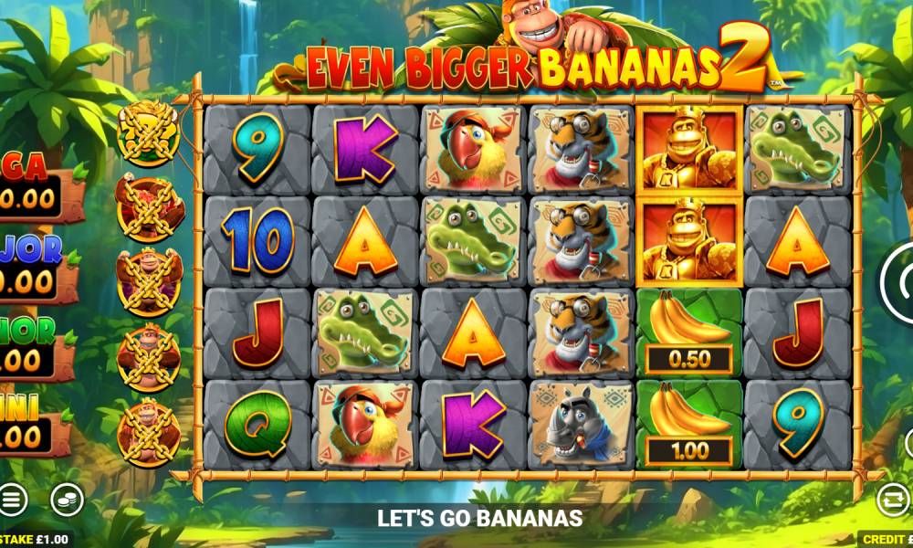 В игровом автомате King Kong Cash Even Bigger Bananas 2 6 барабанов по 4 ряда. Комбинации складываются из одинаковых знаков слева направо с первого столбца подряд. Это означает, что в онлайн-слоте 4096 фиксированных линий для выплат. Старшие символы (Кинг Конг, носорог, тигр, попугай и крокодил) оплачиваются от 2 штук, а младшие (6 знаков карт) — от 3. Максимальный выигрыш составляет х10000 от ставки. Получить его можно при помощи разнообразных бонусы — фриспинов, разблокировки коллекционеров, множителей, денежных символов и джекпотов. Диапазон ставок на спин неплохой — 0.1-25 евро.