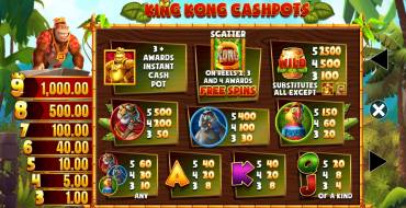 Пять барабанов по три ряда — составляют игровое поле слота King Kong Cashpots. Тигр, носорог, попугай — это старшие символы, A, K, Q, J — младшие. Все они оплачиваются за 3-5 одинаковых штук на линии слева направо. Также награду дают три и более любых вида животных. Линий для выплат фиксировано 20. Есть три специальных символа, бесплатные спины, множители и моментальные крупные выигрыши по шкале. Диапазон ставок на спин скромный — 0.1-10 евро. Максимальный приз составляет х50000 от поставленной суммы.